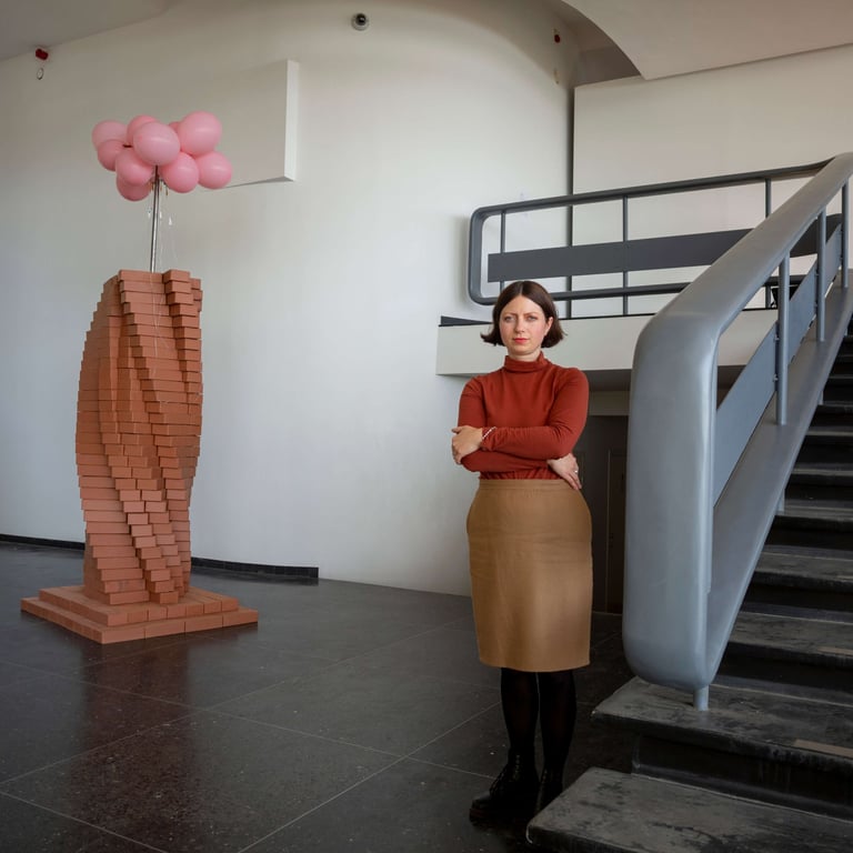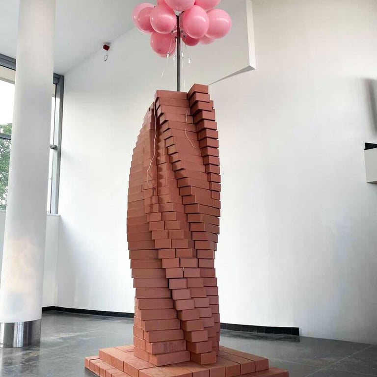 Raw bricks, balloons, catheters, water. Column height 230 cm, 2021